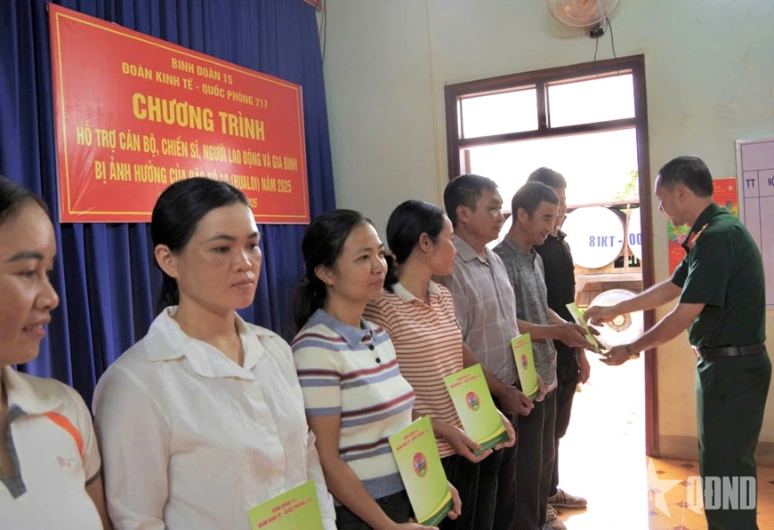 Đoàn Kinh tế - Quốc phòng 717 (Binh đoàn 15) đã trao hỗ trợ 14 gia đình cán bộ, chiến sĩ và người lao động bị ảnh hưởng bởi bão số 10 với số tiền hơn 37 triệu đồng.