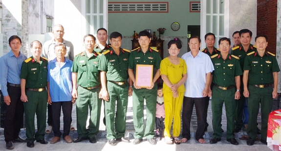 Đại diện Bộ CHQS tỉnh Tây Ninh, các đơn vị trao quyết định quyền sở hữu nhà tặng gia đình Đại úy Dương Văn Tấn, trợ lý Thông tin, Phòng Tham mưu. |