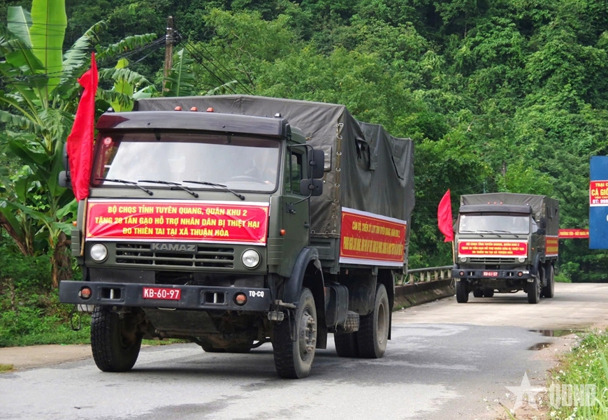 Lực lượng vũ trang tỉnh Tuyên Quang hỗ trợ vận chuyển gạo trao tặng các hộ dân bị thiệt hại do thiên tai tại xã Thuận Hòa. |