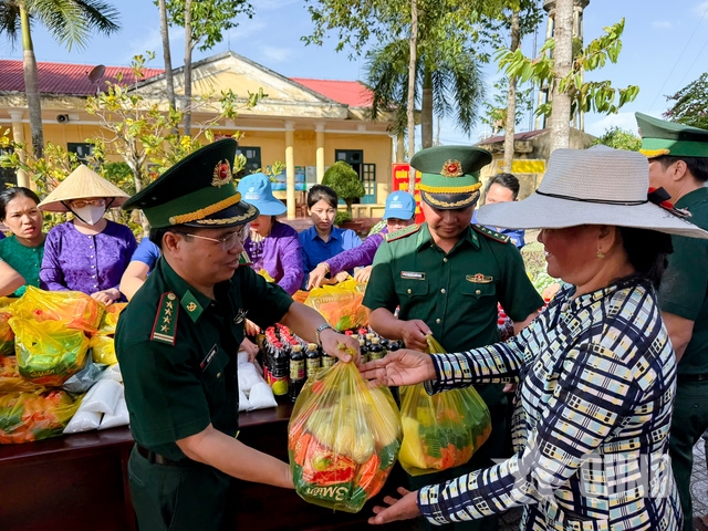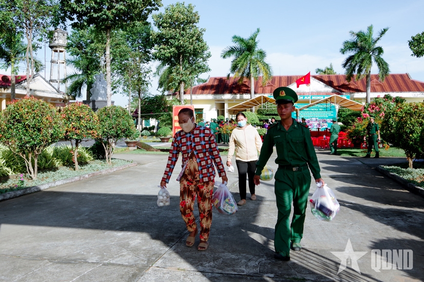 | Các chiến sĩ Đồn Biên phòng Lai Hòa hỗ trợ người dân đến nhận quà.