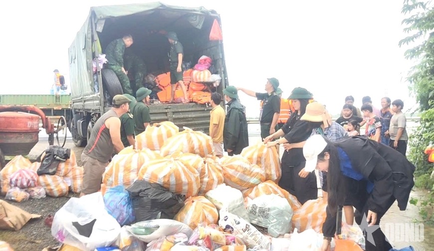 | Trao nhu yếu phẩm tới người dân vùng lũ. |