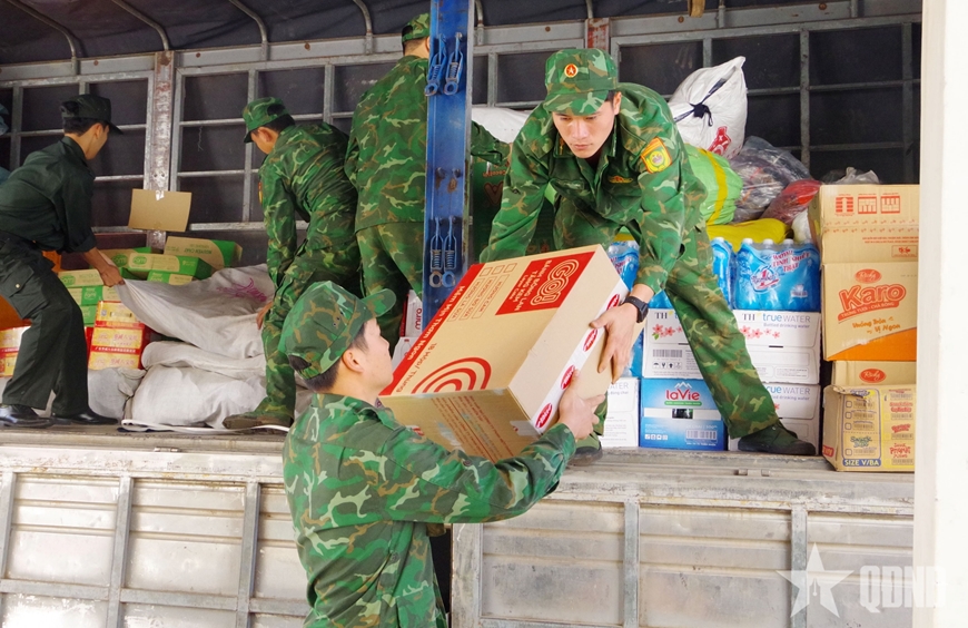 | Cán bộ, chiến sĩ Bộ đội Biên phòng tỉnh Lâm Đồng tham gia vận chuyển thực phẩm hỗ trợ nhân dân vùng lũ. |