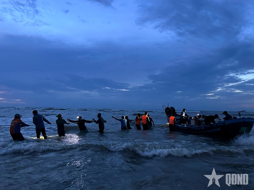 | Cán bộ, chiến sĩ Đồn Biên phòng Tân Thắng (Bộ đội Biên phòng tỉnh Lâm Đồng) hỗ trợ kéo tàu cá của ngư dân bị mắc cạn.