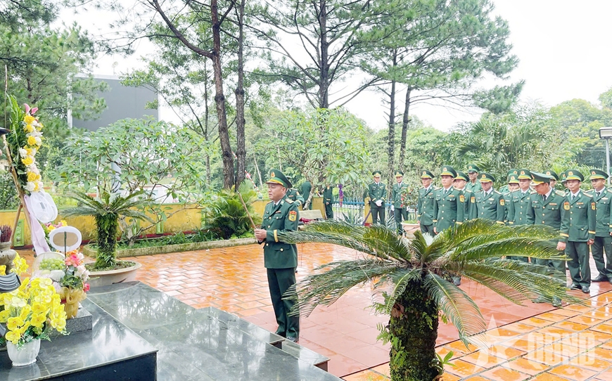 | Đại tá Bùi Đức Chính, Phó chính ủy Ban chỉ huy Bộ đội Biên phòng tỉnh Lâm Đồng cùng cán bộ, chiến sĩ dâng hương tưởng nhớ 16 Anh hùng liệt sĩ của Đồn Biên phòng Cửa khẩu Bu Prăng. |