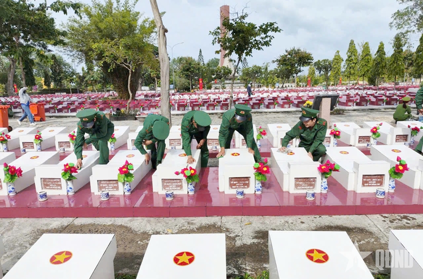 | Cán bộ, chiến sĩ Biên phòng Hải đội 2 tổ chức thăm viếng, tổng dọn vệ sinh tại nghĩa trang liệt sĩ. |