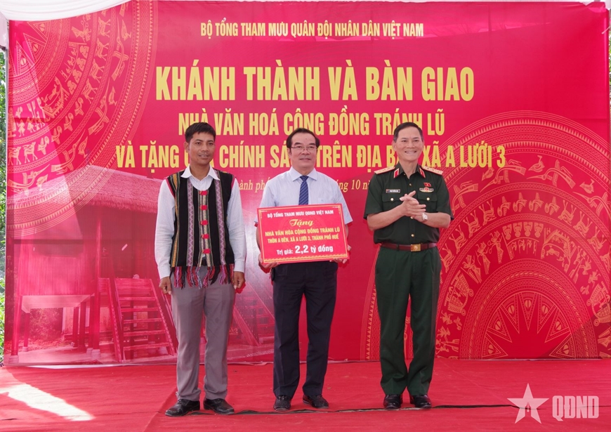 Thượng tướng Phạm Trường Sơn tặng công trình Nhà văn hóa cộng đồng tránh lũ và các phần quà tặng thôn A Đên, các gia đình chính sách trên địa bàn. |