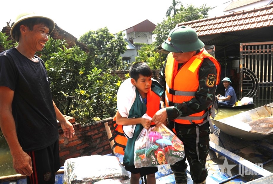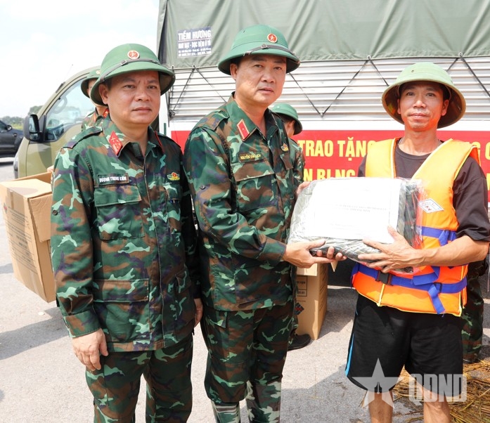 Đoàn công tác của Bộ tư lệnh Quân khu 1 đến trao nhu yếu phẩm của Bộ Quốc phòng hỗ trợ nhân dân tỉnh Bắc Ninh khắc phục hậu quả sau bão số 11. |