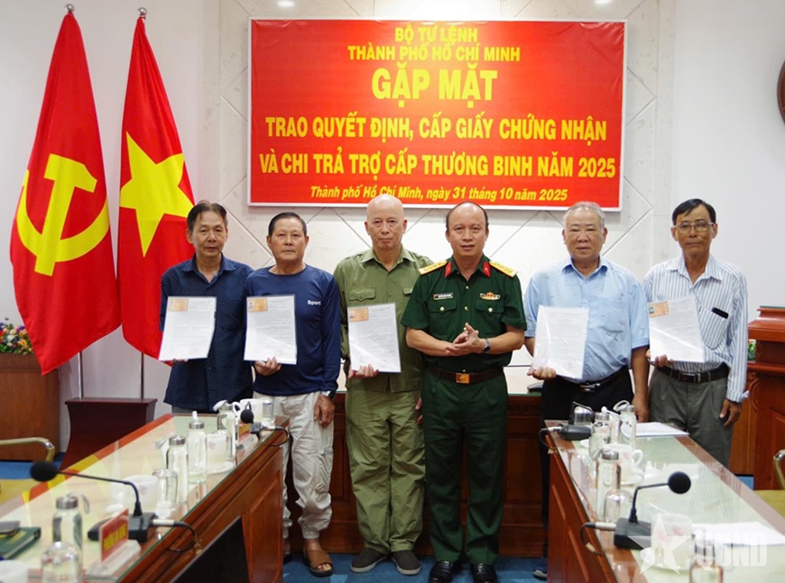 Sáng 31-10, Bộ tư lệnh Thành phố Hồ Chí Minh tổ chức gặp mặt, trao quyết định, cấp giấy chứng nhận thương binh cho 5 cựu quân nhân.