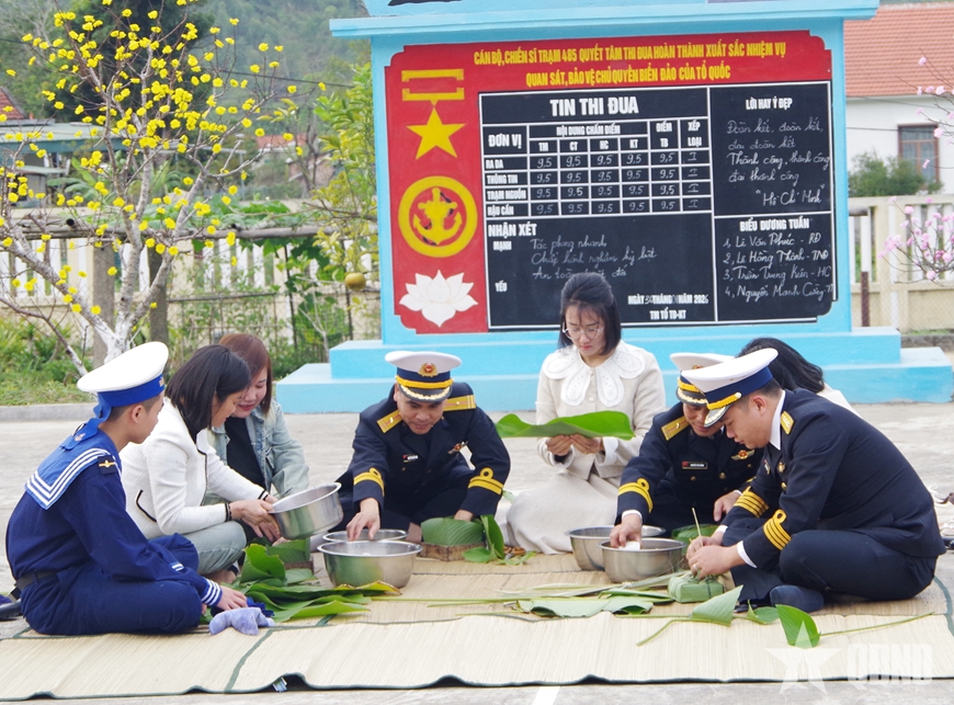 | Quân, dân trên đảo Trà Bản gói bánh chưng. |