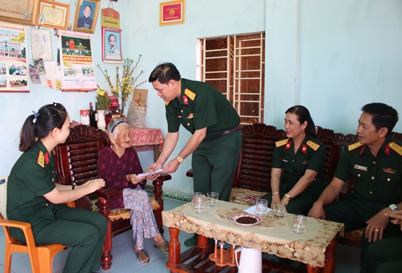 | Đại diện Bộ CHQS tỉnh Đắc Lắc trao quà tặng Bà mẹ Việt Nam anh hùng Đặng Thị Lịch ở xã Hòa Phong, huyện Krông Bông (ảnh chụp trước ngày 27-4-2021). |