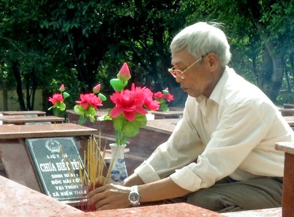 Cựu chiến binh Lê Thanh Hướng thắp hương cho đồng đội ở Nghĩa trang Liệt sĩ huyện Đăk Rlấp (Đắc Nông). |