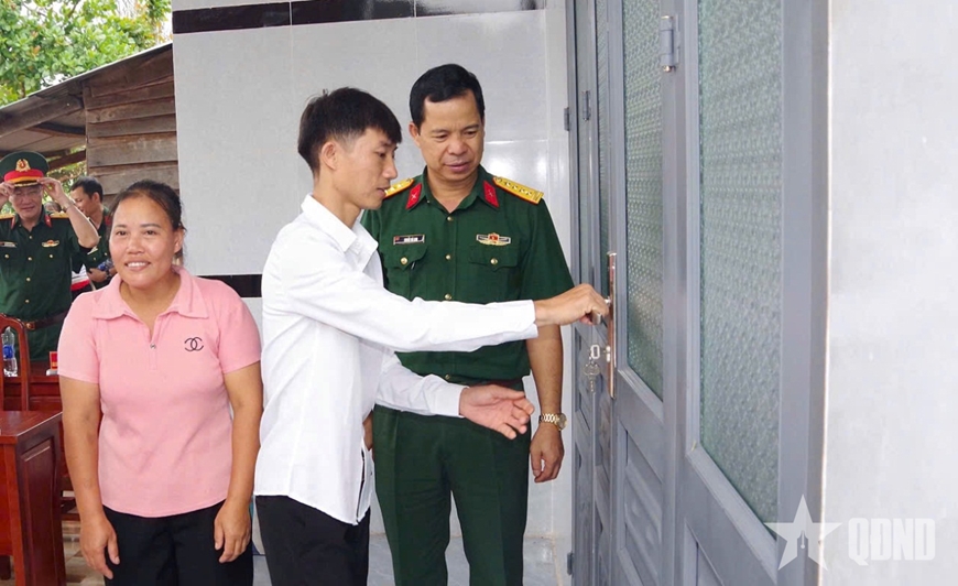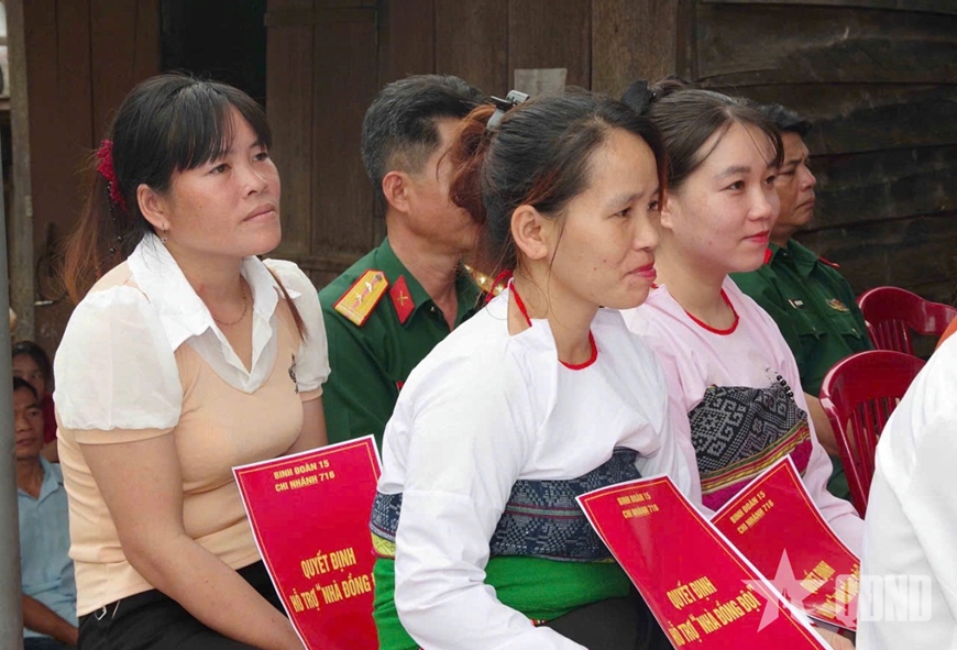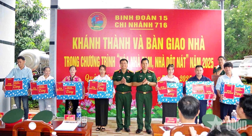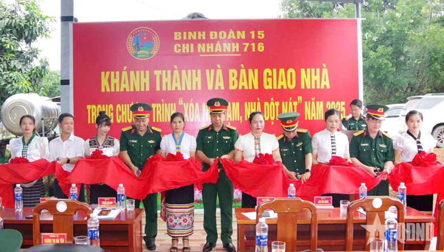 Lãnh đạo Binh đoàn 15 và Chi nhánh 716, cùng đại diện chính quyền địa phương cắt băng khánh thành "Nhà đại đoàn kết" tặng các gia đình.