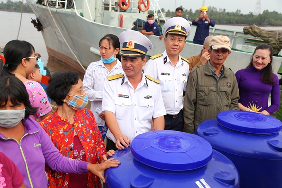 Đã trở thành một nét đẹp văn hóa nghĩa tình, những năm gần đây, cứ vào mùa hạn hán, xâm nhập mặn (HH, XNM), Bộ tư lệnh Quân chủng Hải quân lại chỉ đạo các đơn vị ở phía Nam triển khai chương trình cung cấp nước ngọt miễn phí cho bà con các địa phương ĐBSCL. Năm nay, do ảnh hưởng của biến đổi khí hậu, HH, XNM đến sớm hơn, diễn ra trên diện rộng với cường độ gay gắt nên hàng vạn hộ dân các địa phương ĐBSCL bị thiếu nước sinh hoạt trầm trọng. Thực hiện chỉ đạo của Đảng ủy, Bộ tư lệnh Quân chủng Hải quân, ngay từ trước Tết Nguyên đán, một số đơn vị đã triển khai các chuyến tàu chở nước ngọt cung cấp miễn phí tới nhân dân. Hàng nghìn khối nước được cấp đến người dân. Hiện nay, bên cạnh tình hình HH, XNM đang diễn biến rất khốc liệt, công tác dân vận, cứu trợ của các đơn vị quân đội ở các tỉnh ĐBSCL được gắn liền với nhiệm vụ tuyên truyền, hỗ trợ nhân dân phòng, chống dịch Covid-19. An toàn, hiệu quả, không để bất cứ ai bị bỏ lại phía sau là phương châm hành động của các đơn vị trong thực hiện nhiệm vụ chính trị quan trọng này.