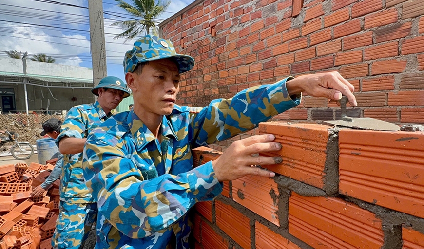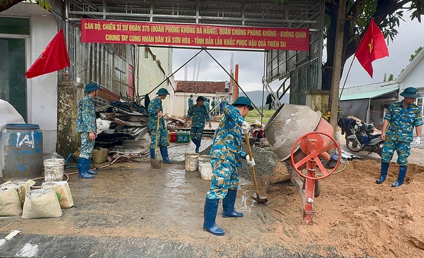 Cán bộ, chiến sĩ Sư đoàn Phòng không 375 giúp nhân dân xã Sơn Hòa, tỉnh Đắk Lắk xây dựng lại nhà sau bão, lũ. Ảnh: DUY ĐỨC