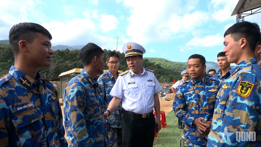 | Chuẩn đô đốc Phạm Minh Tuấn động viên bộ đội hoàn thành xuất sắc nhiệm vụ xây nhà. |