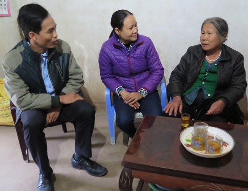 Cán bộ ngành LĐ-TB &XH huyện Nho Quan, tỉnh Ninh Bình đến thăm, động viên bà Trịnh Thị Tiếp (ở xã Lạng Phong) là vợ liệt sĩ, có nhà ở xuống cấp, thuộc diện chờ hỗ trợ để xây mới. Ảnh: MINH ANH