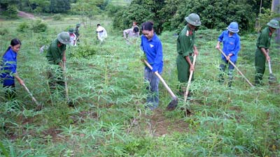 | Chiến sĩ Kho K28 (Quân khu 2) cùng thanh niên địa phương giúp dân xã Mĩ Bằng, huyện Yên Sơn, tỉnh Tuyên Quang làm cỏ sắn |