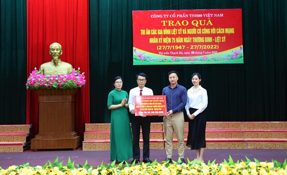 Tiếp nối chuỗi hoạt động của công ty tại Hà Tĩnh, sáng ngày 23-7, Công ty Cổ phần TNH99 Việt Nam đã đồng hành cùng UBND trị trấn Thạch Hà tổ chức buổi gặp mặt trao quà cho người có công và thân nhân người có công với cách mạng cùng Hội viên Hội cựu chiến binh có hoàn cảnh khó khăn trên địa bàn. Cụ thể, công ty đã trao tặng 597 suất quà với tổng trị giá là 298 triệu 500 nghìn đồng.