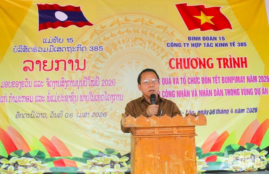 Từ ngày 6 đến 9-4, tại tỉnh Attapeu (Lào), Công ty Hợp tác kinh tế 385 (Binh đoàn 15) tổ chức các hoạt động thăm, tặng quà, đón Tết cổ truyền Bunpimay năm 2026 cùng công nhân và nhân dân địa phương.