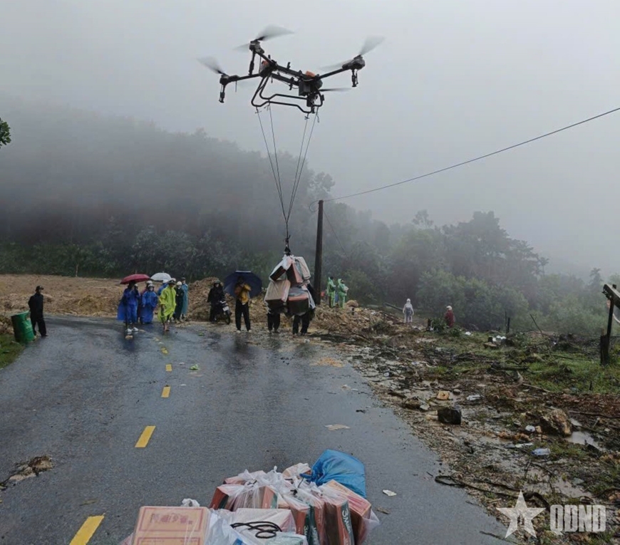 Sử dụng flycam vận chuyển hàng cứu trợ đến từng cụm dân cư bị cô lập tại xã Trà Tân, TP Đà Nẵng. Ảnh: ĐỨC TÍNH