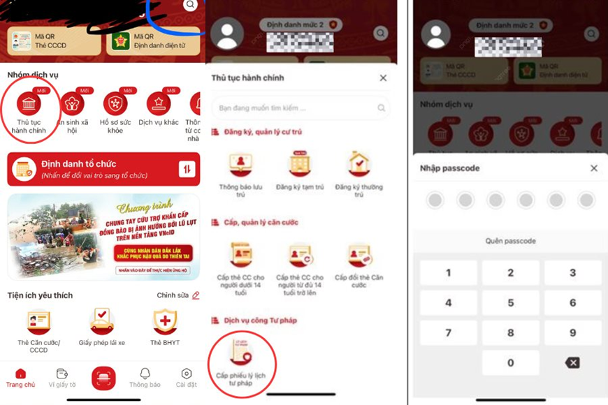 Bước 1: Trước hết, người dùng cần có định danh mức độ 2. Sau khi đăng nhập, người dùng chọn “Thủ tục hành chính”, chọn “Cấp phiếu lý lịch tư pháp” và nhập passcode để sử dụng tính năng.