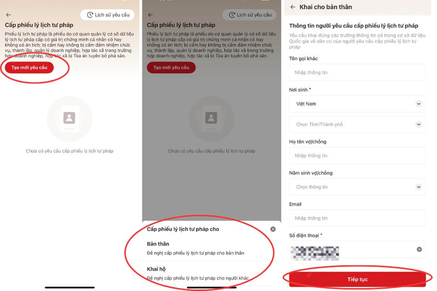 Bước 3: Sau đó, người dùng tiến hành nhập thông tin của người yêu cầu cấp phiếu lý lịch tư pháp và chọn “Tiếp tục” khi hoàn thành.