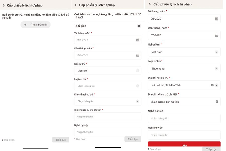 Bước 4: Người dùng tiến hành nhập quá trình cư trú, nghề nghiệp, nơi làm việc bằng cách chọn “Thêm thông tin”, sau đó chọn "Tiếp tục" và điền cách thông tin được yêu cầu. Khi nhập xong, người dùng chọn “Lưu” và nhấn “Tiếp tục” để sang bước tiếp theo.