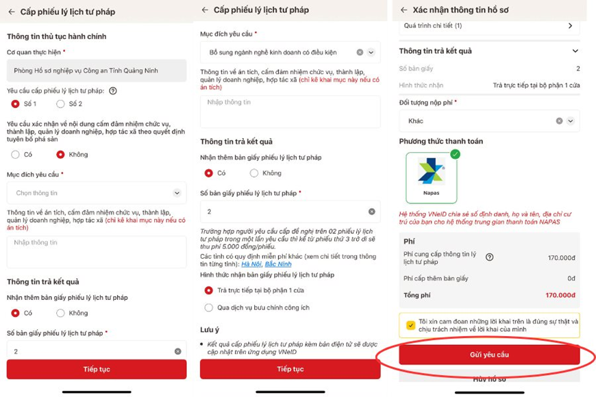 Bước 6: Sau khi điền xong, cửa sổ “Xác nhận thông tin hồ sơ” mở ra, đi kèm với khoản phí phải đóng. Người dùng ấn “Gửi yêu cầu” và tiến hành thanh toán.