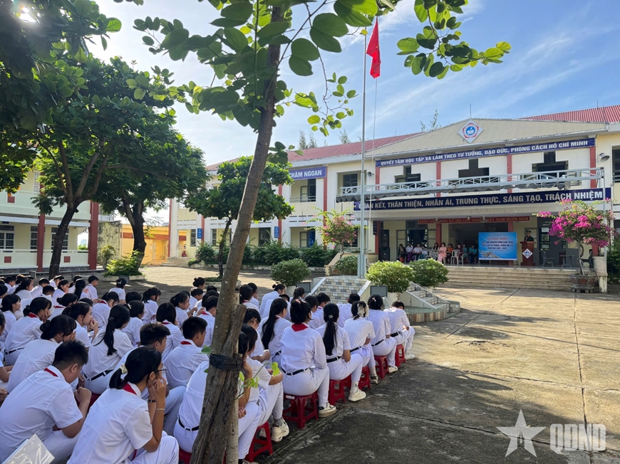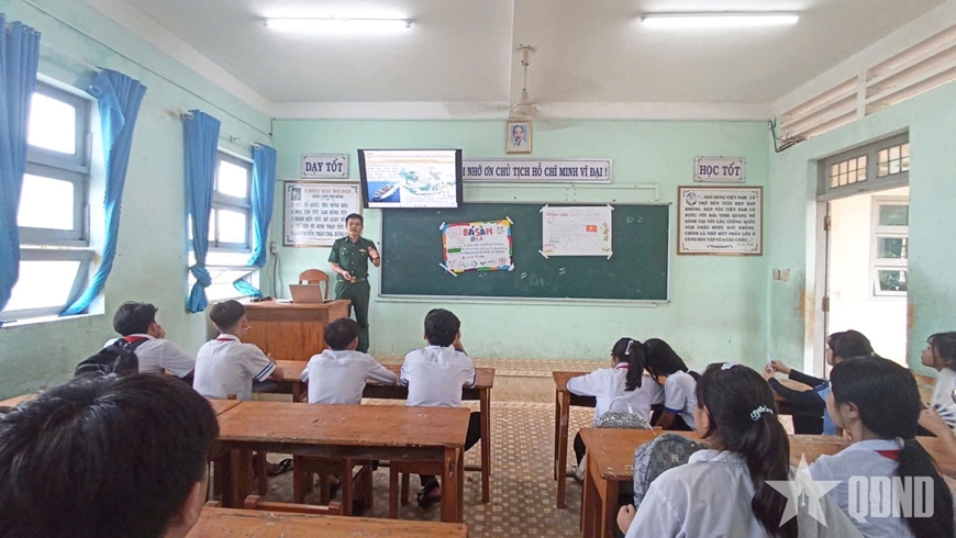 Đồn Biên phòng Hòa Hiệp Nam phối hợp tuyên truyền chủ quyền biển, đảo tới các em học sinh.