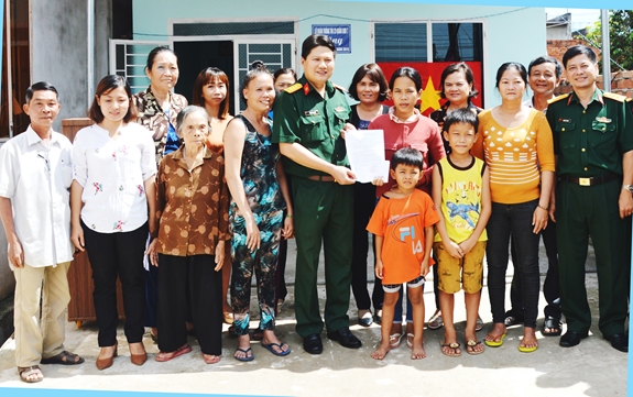 Đại diện Lữ đoàn Thông tin 23 (Quân khu 7) trao quyết định tặng nhà tình nghĩa tới gia đình chính sách ở huyện Xuân Lộc. Ảnh: LÊ HOAN. |