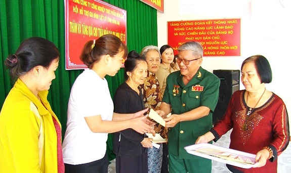Đại diện Hội Hỗ trợ gia đình liệt sĩ tỉnh Đồng Nai tặng quà đối tượng chính sách ở huyện Xuân Lộc. Ảnh: LÊ HOAN. |