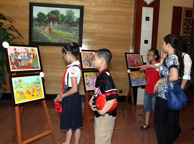 Tham quan gian trưng bày các tác phẩm của trẻ em bên lề lễ mít tinh.