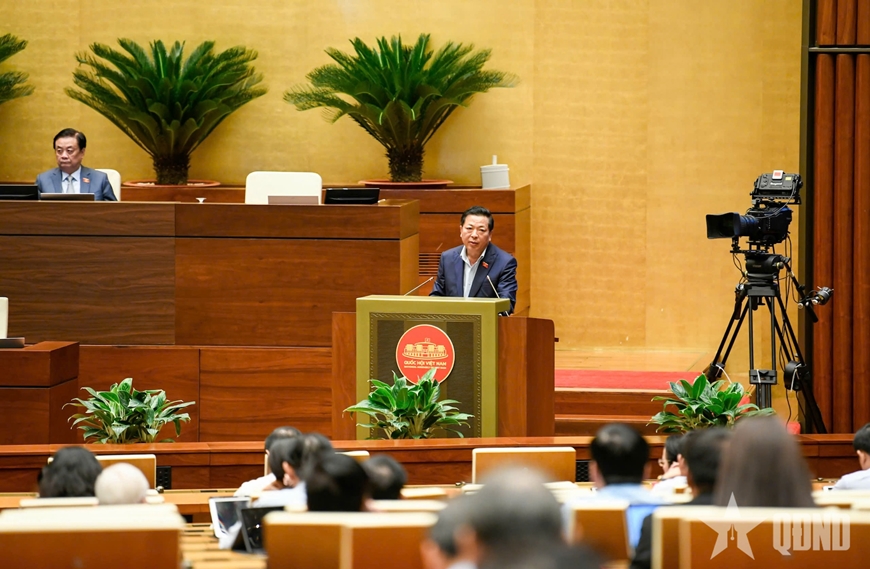 | Bộ trưởng Bộ Xây dựng Trần Hồng Minh phát biểu giải trình trước Quốc hội. Ảnh: TRỌNG HẢI |