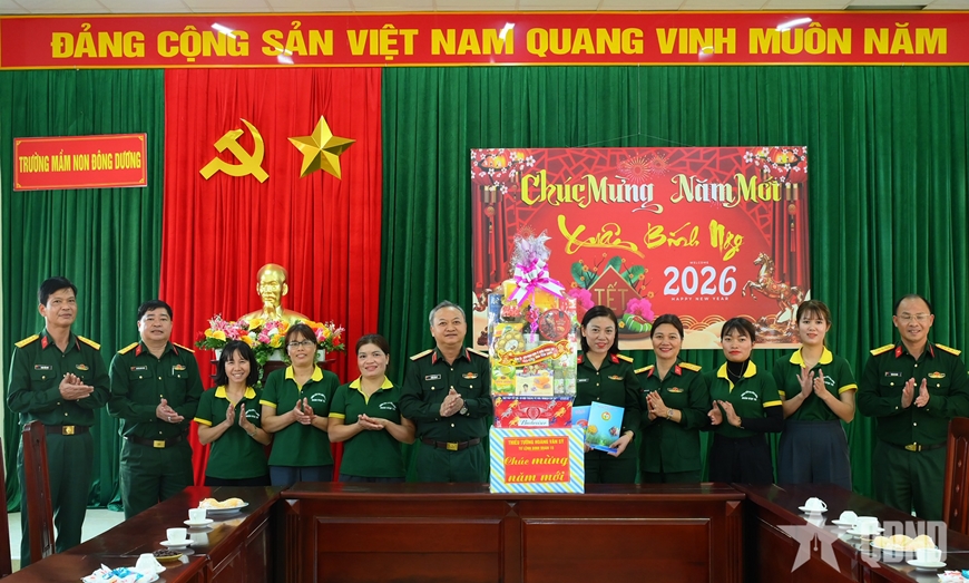 | Thiếu tướng Hoàng Văn Sỹ và lãnh đạo Đoàn Kinh tế - Quốc phòng 732 thăm, chúc Tết, tặng quà Trường Mầm non Đông Dương. |