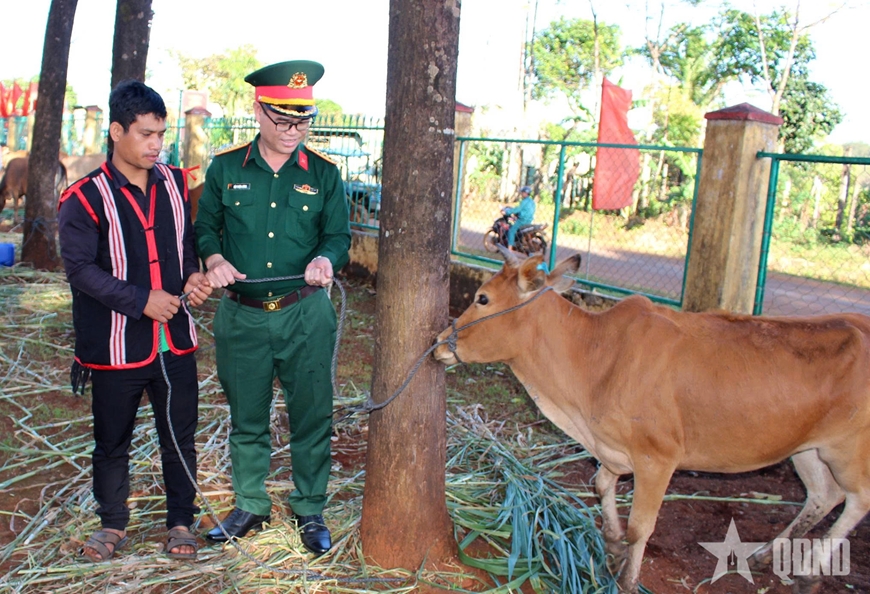 | Đại tá Đậu Thiện Lương, Đoàn trưởng Đoàn Kinh tế - Quốc phòng 74 trao bò giống hỗ trợ người dân. |
