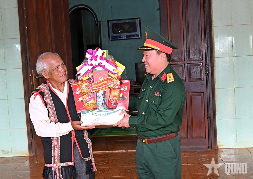 | Đại tá Trần Ngọc Hải thăm, chúc Tết, tặng quà già làng Rơ Mah Duen. |