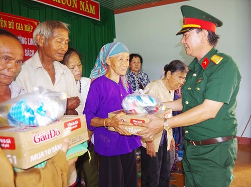 Các gia đình chính sách, đồng bào S’tiêng nghèo xã Đắk Ơ, huyện Bù Gia Mập, tỉnh Bình Phước được Đoàn KT-QP 778 tặng quà.