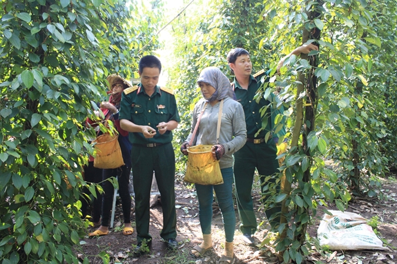 Cán bộ công đoàn Trung đoàn 717 (Binh đoàn 16) hướng dẫn kỹ thuật chăm sóc, thu hoạch hồ tiêu cho người lao động. |