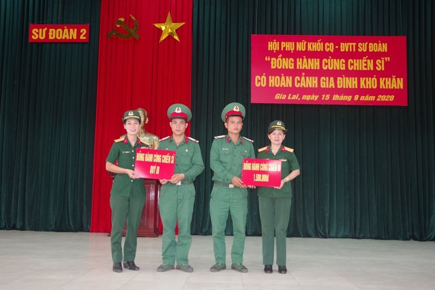 Nói về việc quan tâm, hỗ trợ chiến sĩ có hoàn cảnh khó khăn, Đại úy QNCN Lê Thị Hoa, Chủ tịch Hội Phụ nữ cơ quan Sư đoàn 2, cho biết: “Qua các buổi đối thoại dân chủ, nhiều hoàn cảnh, khúc mắc của chiến sĩ, nhất là chiến sĩ mới được bộc bạch, sẻ chia, giãi bày. Với mong muốn hỗ trợ phần nào, giúp chiến sĩ mới có hoàn cảnh đặc biệt vượt qua khó khăn, Hội Phụ nữ khối cơ quan và đơn vị trực thuộc sư đoàn đã phát động chị em thực hành tiết kiệm, đẩy mạnh tăng gia quanh bếp, quanh vườn đóng góp quỹ để vận hành mô hình “Đồng hành cùng chiến sĩ”. Cùng với tham gia “Tổ tư vấn tâm lý-pháp lý quân nhân”, các chị thường xuyên thăm hỏi, tặng quà quân nhân mắc bệnh đang điều trị tại bệnh xá; tổ chức khâu vá quần áo, tặng quà chiến sĩ dịp tổ chức sinh nhật hằng tháng...