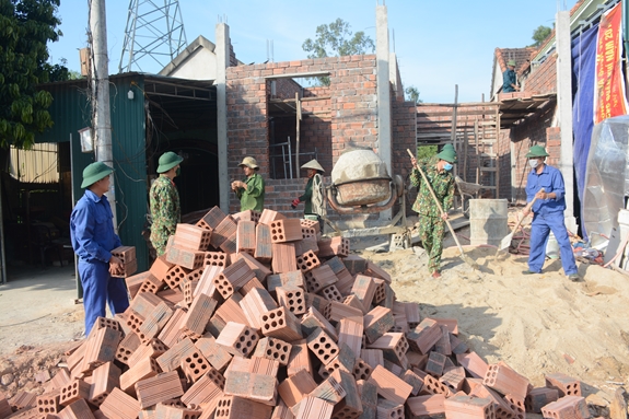 Cán bộ, chiến sĩ Xưởng 265 giúp người dân xã Nghĩa Thuận xây nhà tình nghĩa. |