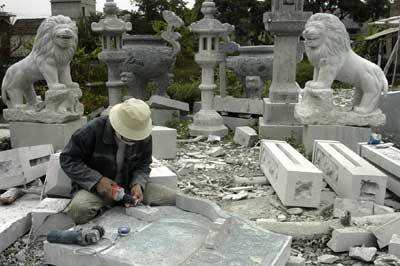 | Nghề chạm khắc đá ở xã Ninh Vân, huyện Hoa Lư (tỉnh Ninh Bình) đã giải quyết việc làm cho nhiều lao động, nhưng lại chưa có giải pháp… hạn chế bụi. Ảnh: Đình Huệ |