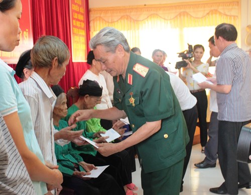 Trung tướng Lê Văn Hân, Chủ tịch Hội Hỗ trợ gia đình liệt sĩ Việt Nam trao quà tặng người có công tại tỉnh Tuyên Quang. Ảnh: LÊ QUÝ HOÀNG.