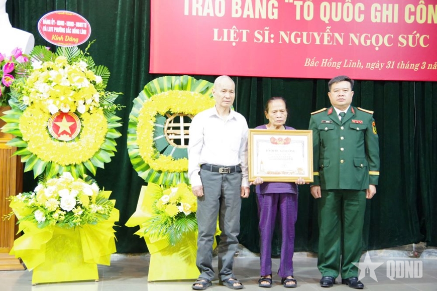Đại tá Nguyễn Hà, Phó chủ nhiệm Chính trị Bộ CHQS tỉnh Hà Tĩnh trao Bằng “Tổ quốc ghi công” liệt sĩ Nguyễn Ngọc Sức tới vợ chồng con gái của liệt sĩ.