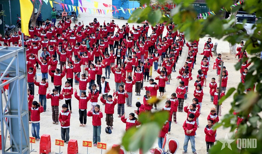 | Toàn bộ học sinh Trường Phổ thông Dân tộc bán trú Tiểu học và Trung học cơ sở Bảo Thắng khoác lên chiếc áo ấm mới. |