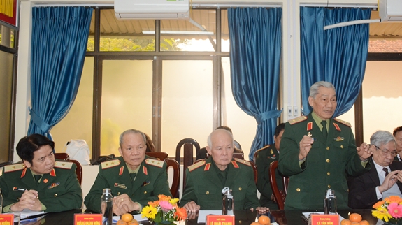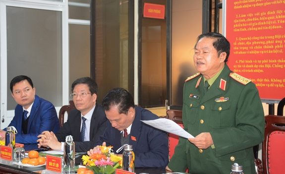 Trung tướng Lê Văn Hân báo cáo kết quả hoạt động của Hội Hỗ trợ gia đình liệt sĩ Việt Nam với đoàn công tác.