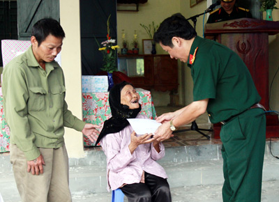 Đại tá Đào Tô Hiệu, Phó trưởng Phòng Hậu phương quân đội, Cục Chính sách (TCCT) tặng quà mừng cụ Lê Thị Quý có ngôi nhà mới