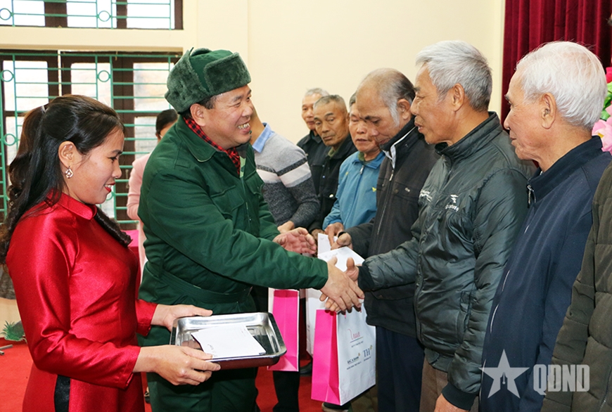 | Thiếu tướng Đoàn Xuân Bộ, Bí thư Đảng ủy, Tổng biên tập Báo Quân đội nhân dân trao quà tặng người có công xã Bằng Luân, tỉnh Phú Thọ. Ảnh: HUY ĐĂNG |