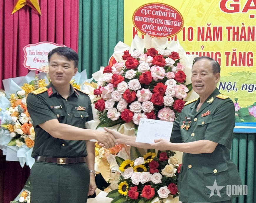 | Đại tá Lê Xuân Thành, Phó chủ nhiệm Chính trị Binh chủng Tăng thiết giáp (bên trái) trao quà chúc mừng Hội. |