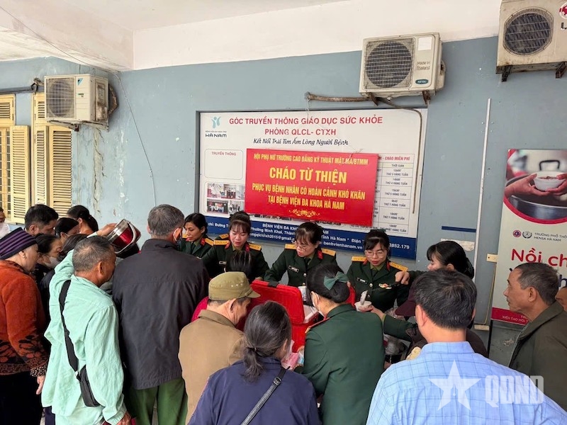 Chiều 30-1, trong không khí ấm áp nghĩa tình tại Bệnh viện Đa khoa Hà Nam (tỉnh Ninh Bình), Hội Phụ nữ Trường Cao đẳng Kỹ thuật Mật mã, Bộ Tổng Tham mưu tổ chức chương trình thiện nguyện “Nồi cháo yêu thương”, trao hơn 200 suất cháo miễn phí tặng các bệnh nhân nghèo, bệnh nhân có hoàn cảnh khó khăn đang điều trị tại bệnh viện.