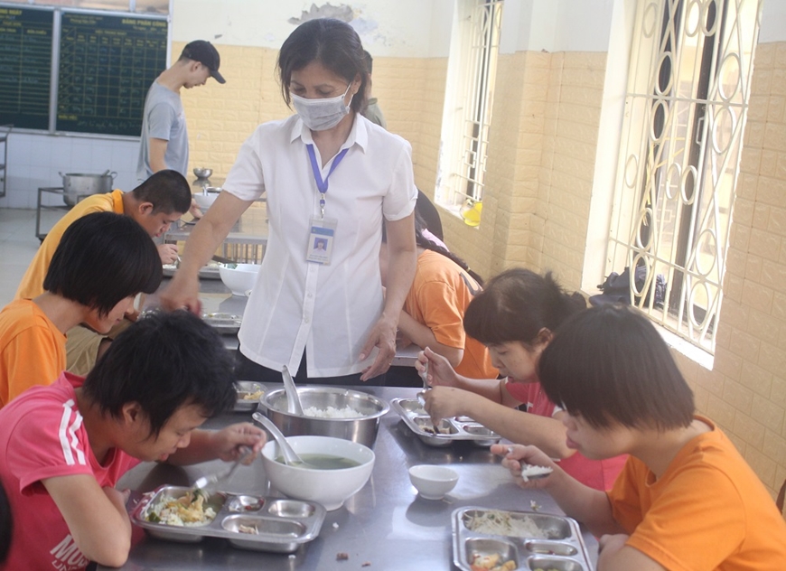| Mẹ Nguyễn Thị Hiền chia cơm trưa cho các em. |